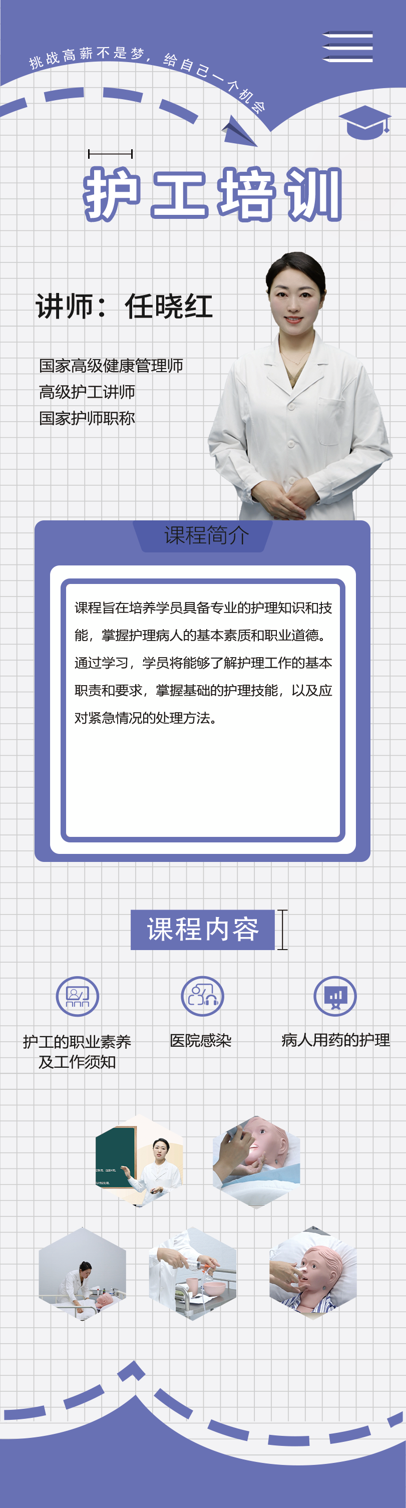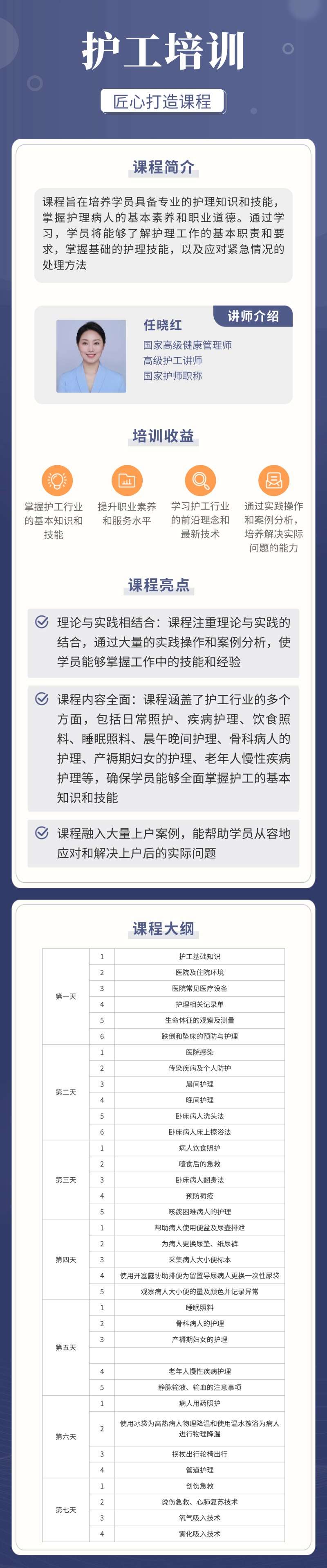 课程旨在培养学员具备专业的护理知识和技能,掌握护理病人的基本素质和职业道德。通过学习,学员将能够了解护理工作的基本职责和要求,掌握基础的护理技能,以及应对紧急情况的处理方法。